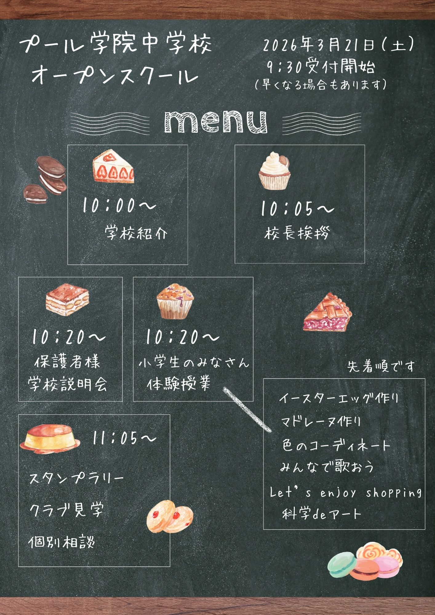 ハガキ(参加票)の発送は3月9日(月)正午までお申込みの方へお送りします。 それ以降またはハガキの届かない方は、当日受付にて対応いたします。 内容(予定) 学校説明、体験授業(先着順)、校内・クラブ見学などを予定しています。 |