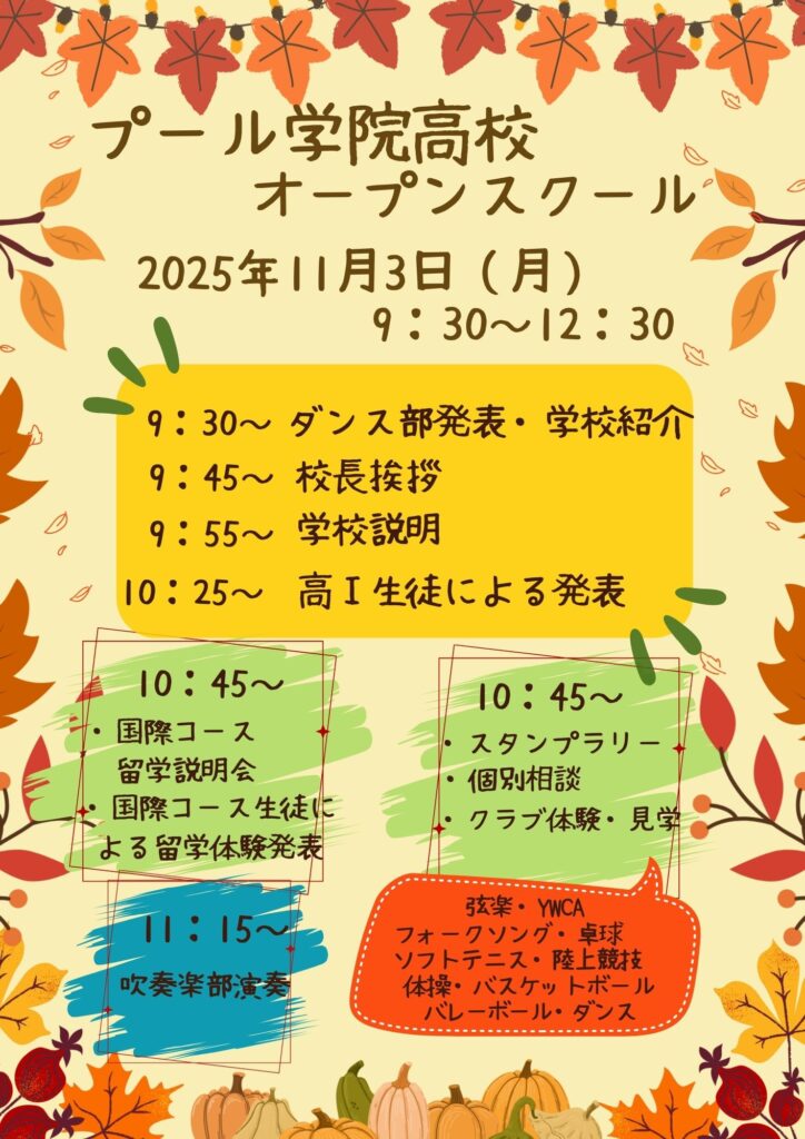 【20251028_1400更新】 ハガキの発送は10月28日(火)正午迄のお申し込みの方で終了しました。 それ以降のお申し込み、またはハガキが届かない方は当日受付で申し出てください。 内容(予定): 学校説明、個別相談(希望者)、国際コース説明、校内見学、スタンプラリー、クラブ体験・見学など |