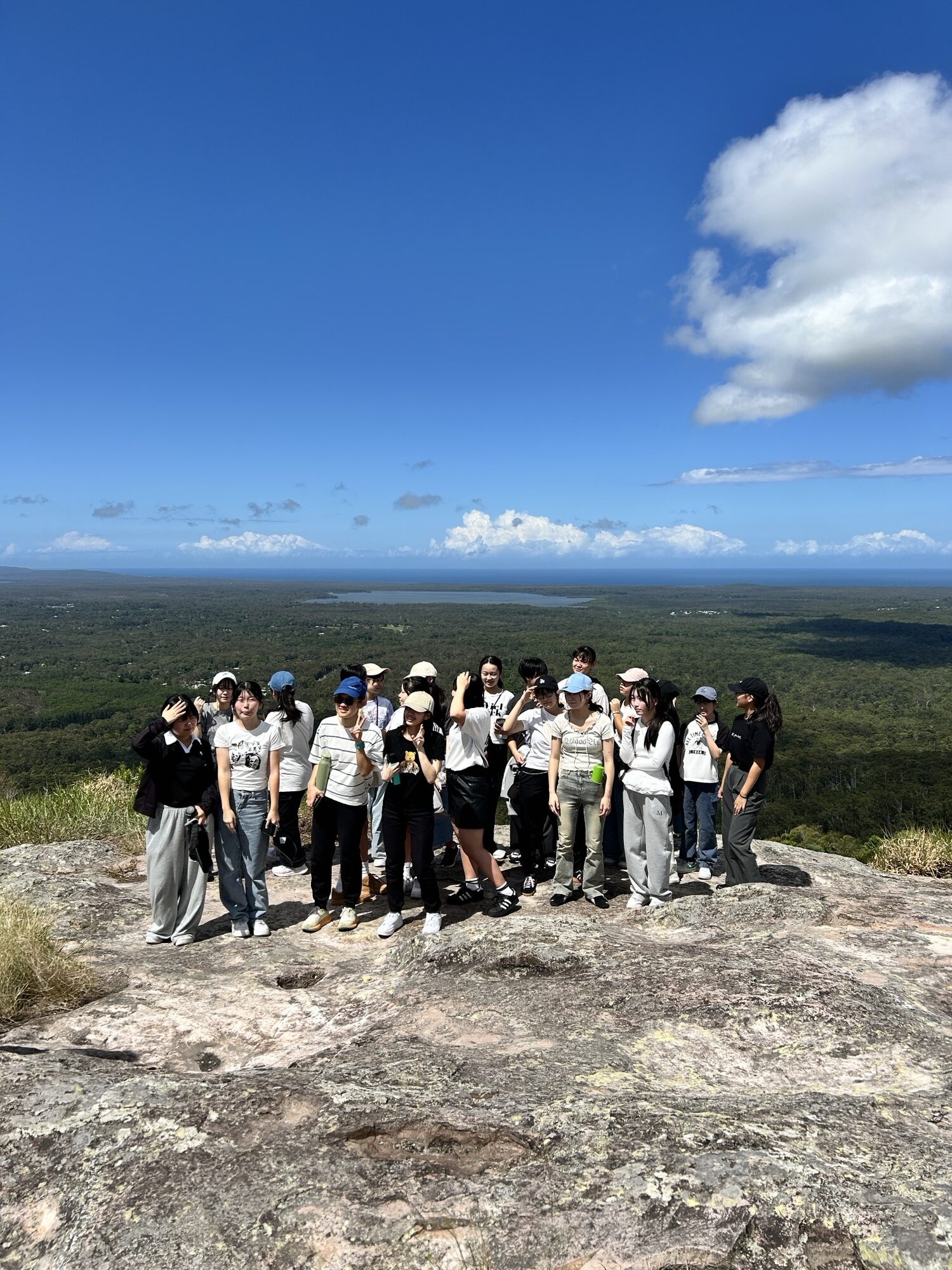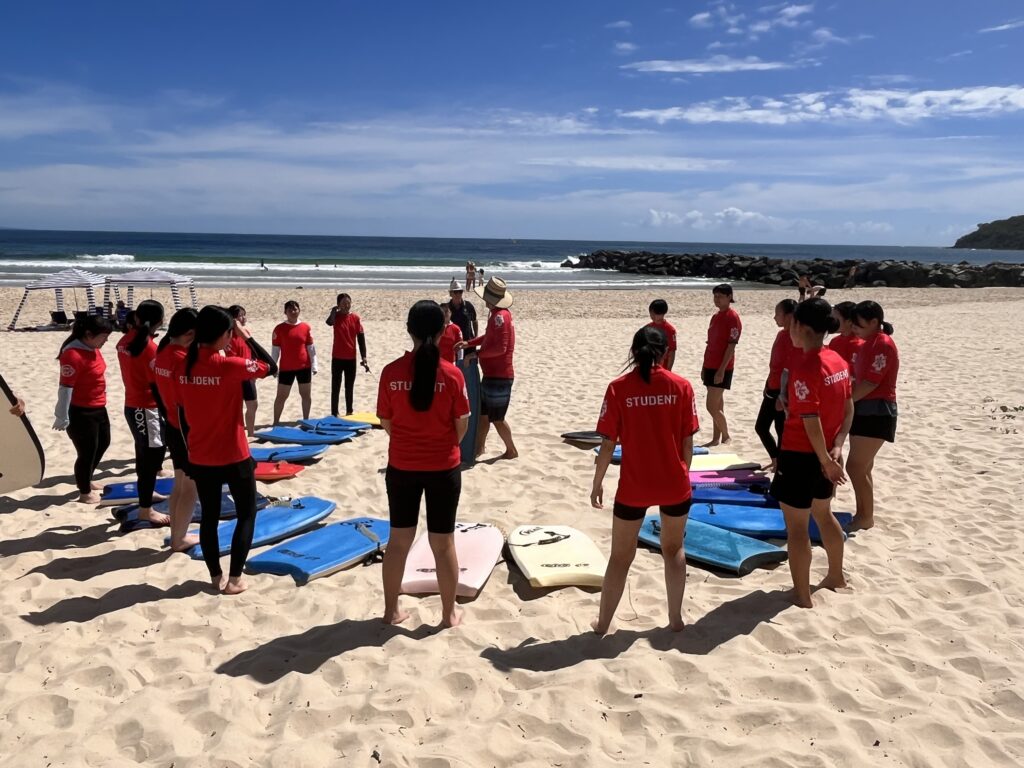 午後のプログラムはヌーサの街散策でした。小高い丘に登り、頂上に着いたら、その景色に感動です。ヌーサの街(森)を上から眺めました。次にヌーサビーチへ。白い砂浜と青い海と波の音を堪能して、マーティン先生御用達のアイスクリーム屋さんへ。並んでる時はドキドキ、上手に英語で注文できたようです。