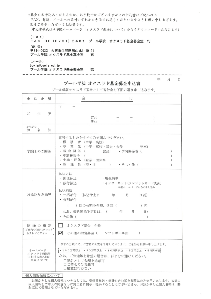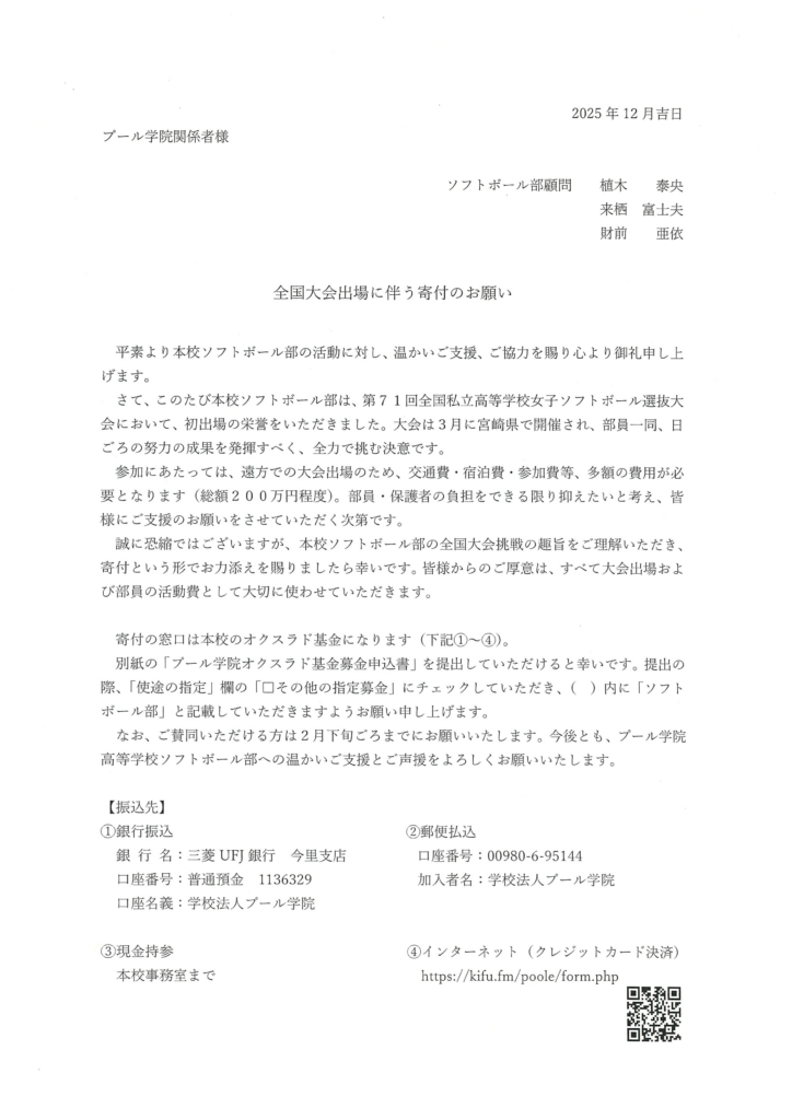 なお、大会参加にあたっては、交通費・宿泊費・参加費等、多額の費用が必要となります。部員・保護者の負担をできる限り抑えたいと考え、関係のみなさまに寄付という形でお力添えをお願いしたいと考えております。寄付の窓口は本校のオクスラド基金になります。本校ソフトボール部の全国大会挑戦の趣旨をご理解いただき、無理のない範囲でご協力いただけると幸いです。https://kifu.fm/poole/form.php